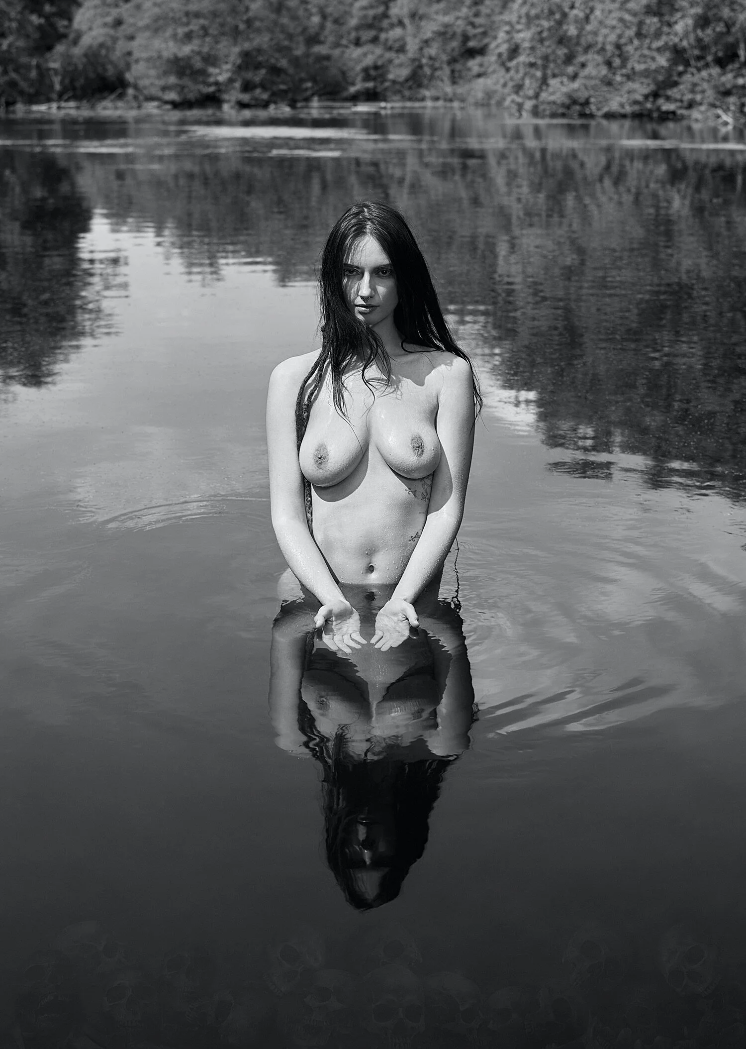 However once I got back to the UK and began working on the images I found that it did not sit as nicely as I had planned and so I decided to stick solely with the nude image choosing a more welcoming pose, I then implemented some skulls which can be seen if you look very closely into the shadows. For me this worked out better than my original idea for after testing the image out with a few close friends I found that they were drawn to the nude woman in the lake and it took them a long time to notice the skulls and for some they did not notice the skulls at all. This was precisely what I wanted to convey in the image, rather than an obvious evil which my original idea would have shown this idea forces the viewer to look a little closer, see below: